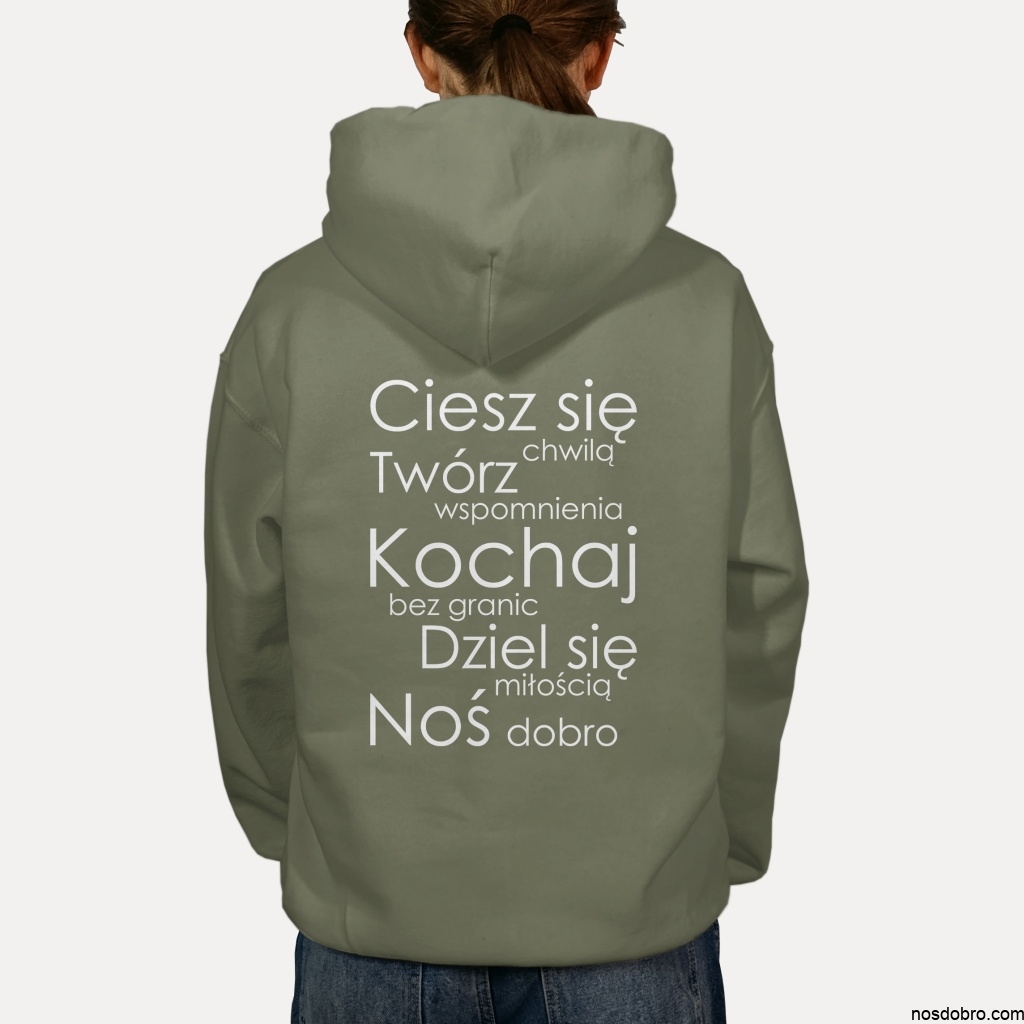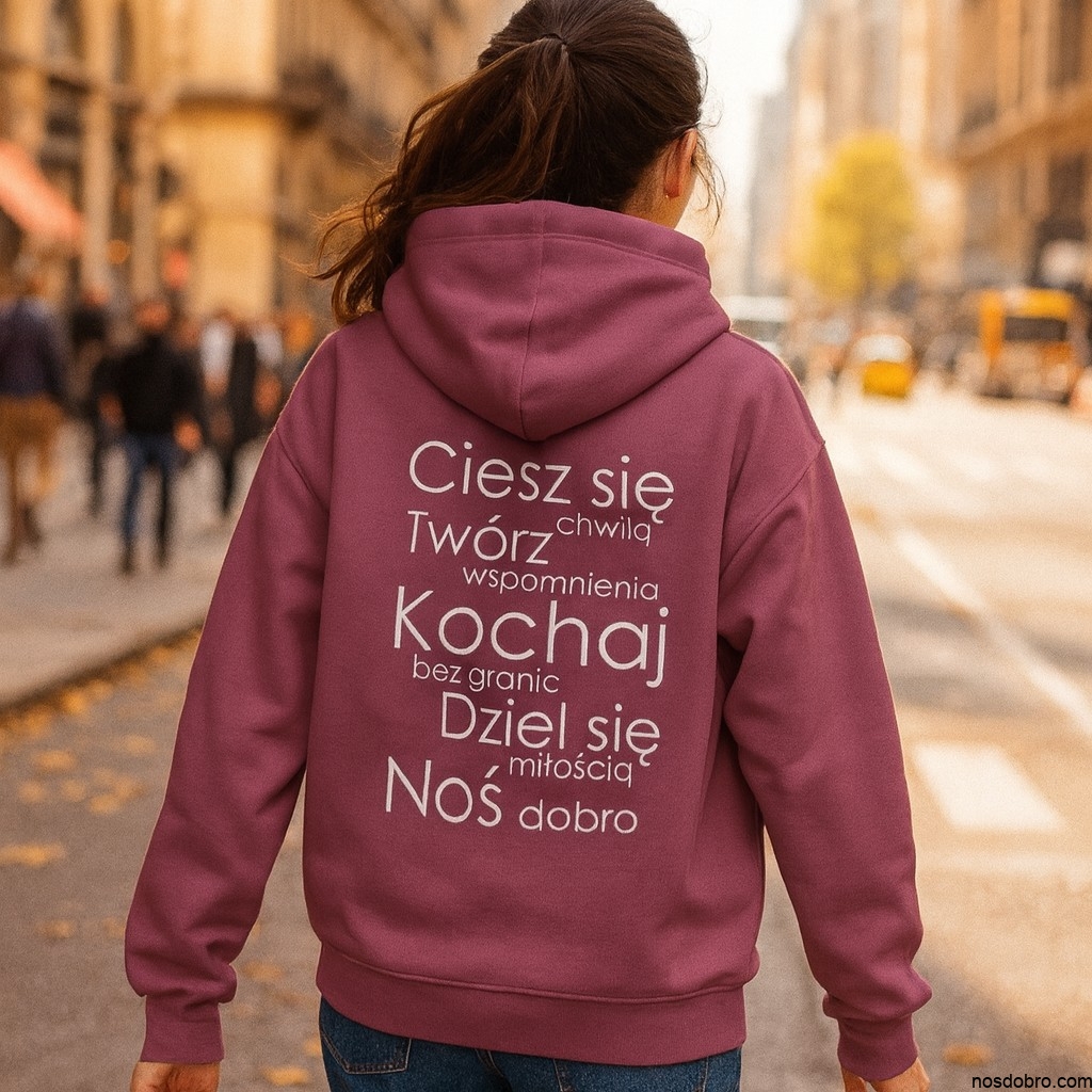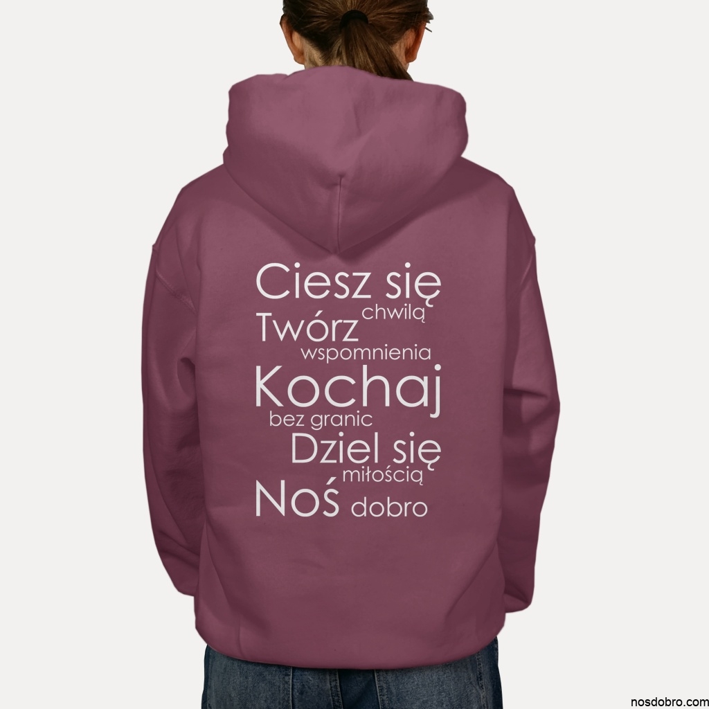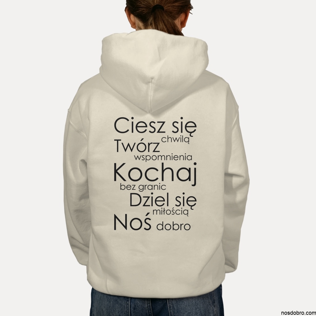 Bluza oversize z kapturem Ciesz się chwilą • Twórz wspomnienia • Kochaj bez granic • Dziel się miłością • Noś dobro to manifest pozytywnego życia zamknięty w wygodnym, codziennym ubraniu. Miękka, komfortowa i uniwersalna – otuli Cię ciepłem i przypomni o tym, co w życiu naprawdę ważne. Idealna dla tych, którzy chcą nie tylko dobrze wyglądać, ale też inspirować innych.