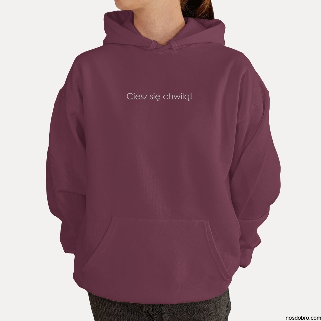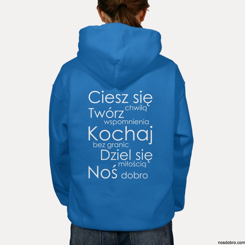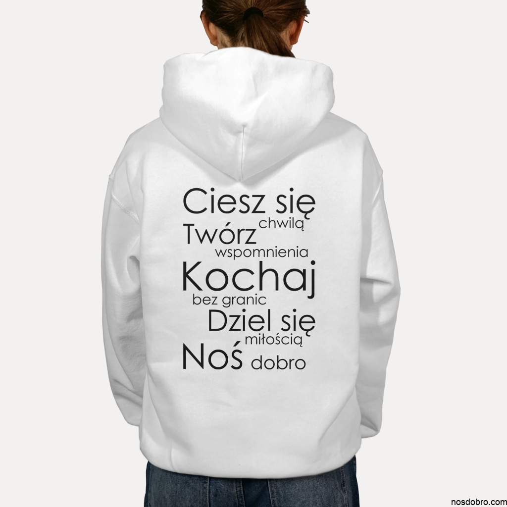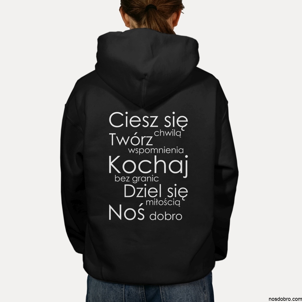 Bluza oversize z kapturem Ciesz się chwilą • Twórz wspomnienia • Kochaj bez granic • Dziel się miłością • Noś dobro to manifest pozytywnego życia zamknięty w wygodnym, codziennym ubraniu. Miękka, komfortowa i uniwersalna – otuli Cię ciepłem i przypomni o tym, co w życiu naprawdę ważne. Idealna dla tych, którzy chcą nie tylko dobrze wyglądać, ale też inspirować innych.