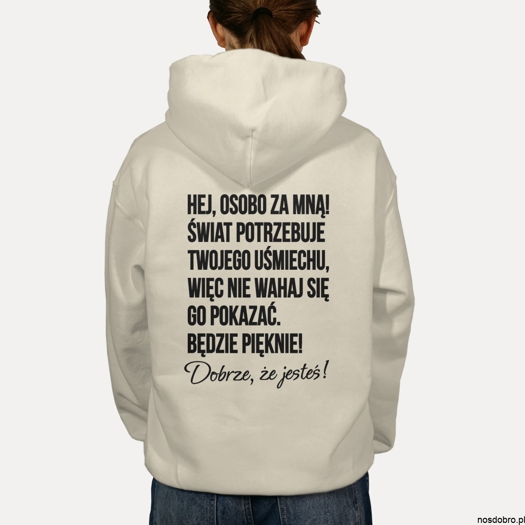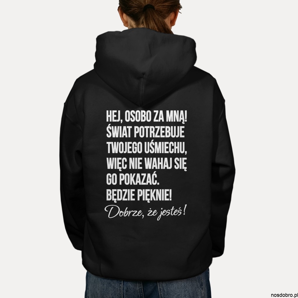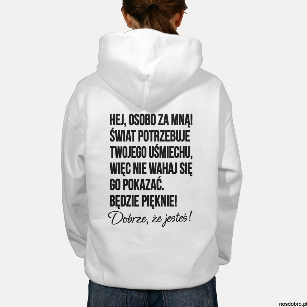Ta wyjątkowa bluza z nadrukiem na plecach to manifest życzliwości, który wywoła uśmiech na twarzy każdego, kto za Tobą stoi. Wykonana z miękkiego materiału, nie tylko zapewni Ci komfort i ciepło, ale przede wszystkim przypomni innym, że świat potrzebuje ich uśmiechu. Z przodu na piersi mały napis "Dobrze, że jesteś!"