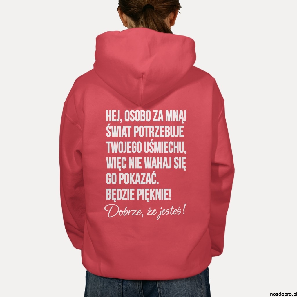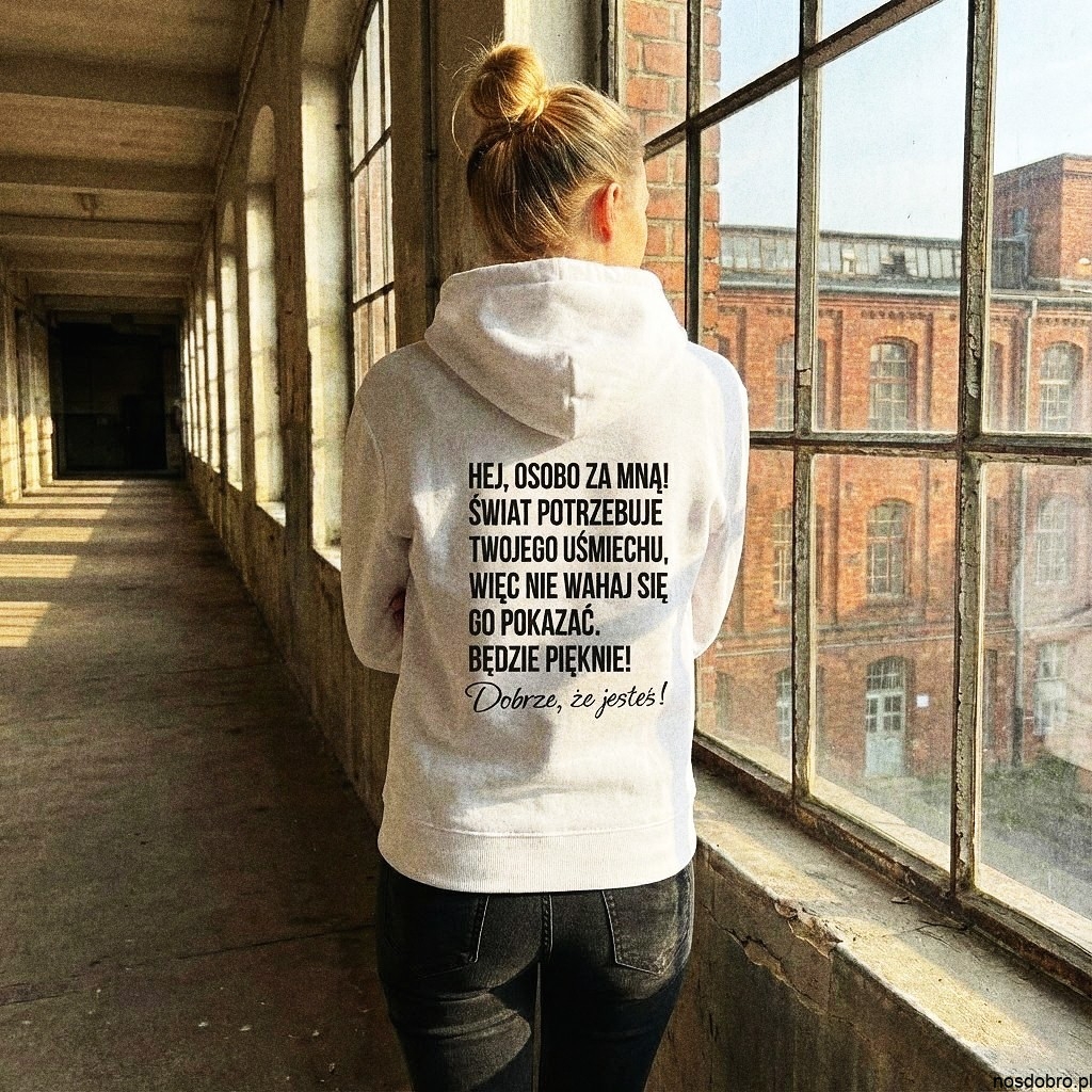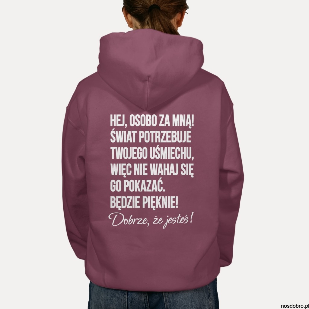Ta wyjątkowa bluza z nadrukiem na plecach to manifest życzliwości, który wywoła uśmiech na twarzy każdego, kto za Tobą stoi. Wykonana z miękkiego materiału, nie tylko zapewni Ci komfort i ciepło, ale przede wszystkim przypomni innym, że świat potrzebuje ich uśmiechu. Z przodu na piersi mały napis "Dobrze, że jesteś!"