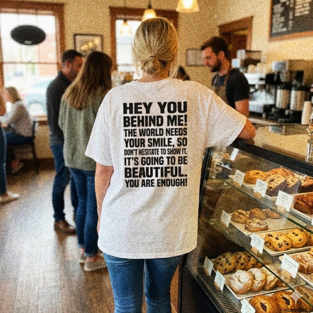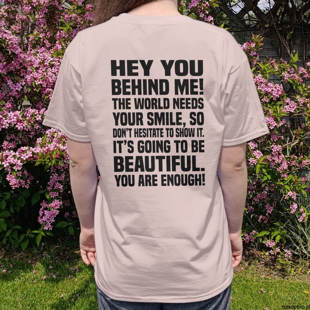 Zamień zwykły spacer w misję wywoływania uśmiechów! Ta wyjątkowa koszulka z budującym napisem na plecach: "Hey you behind me! The world needs your smile..." to doskonały sposób, by poprawić dzień każdemu, kto za Tobą idzie. Przewiewna bawełna i klasyczny krój sprawiają, że to idealny wybór na cieplejsze dni, łączący codzienną wygodę z pięknym, inspirującym przesłaniem.